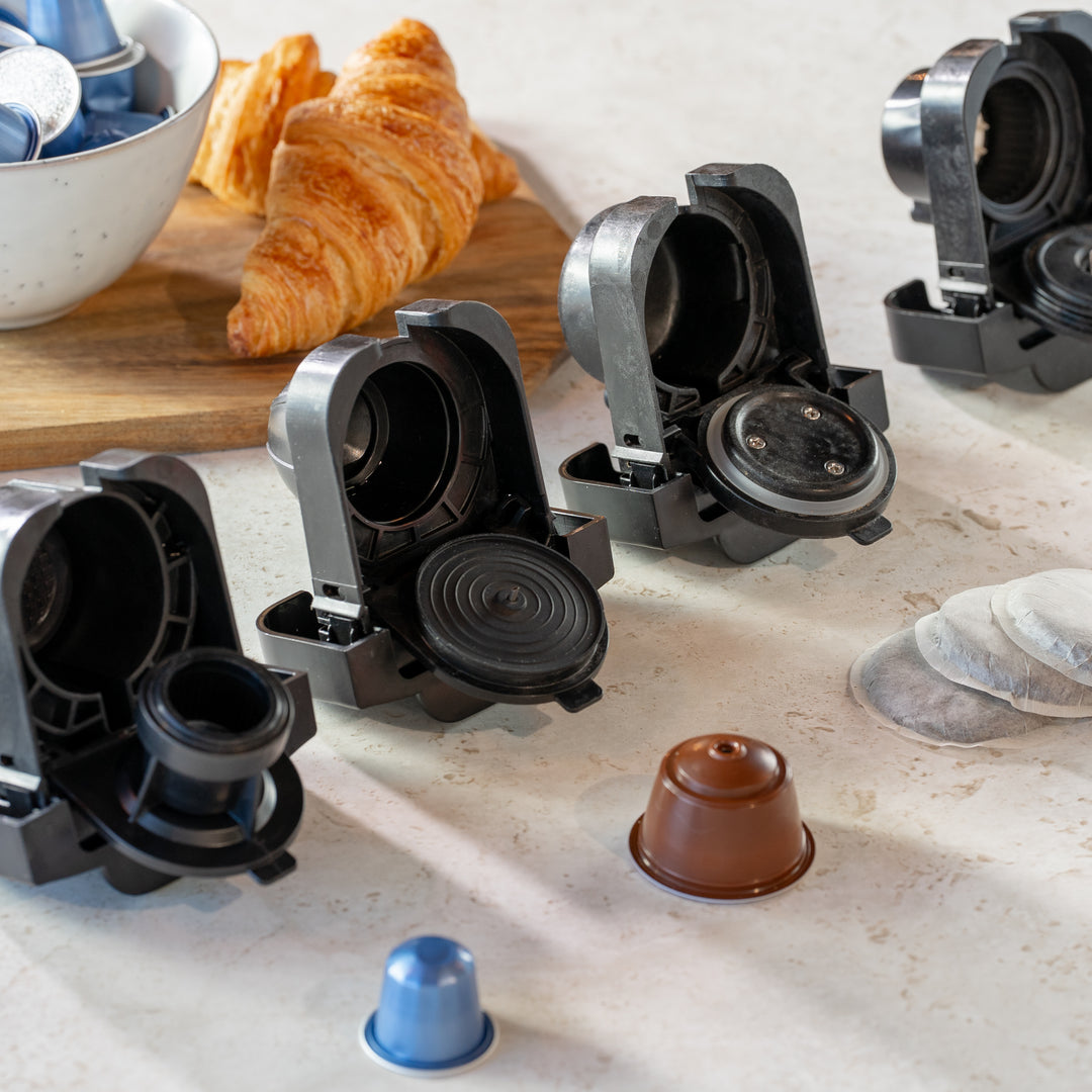- Kapselkompatibilitet: Nespresso-kapslar (adapter ingår). Ytterligare kompatibilitet med Dolce Gusto, Lavazza Blue, Soft Pod, ESE pods och malet kaffe via extra adaptrar (säljs separat).